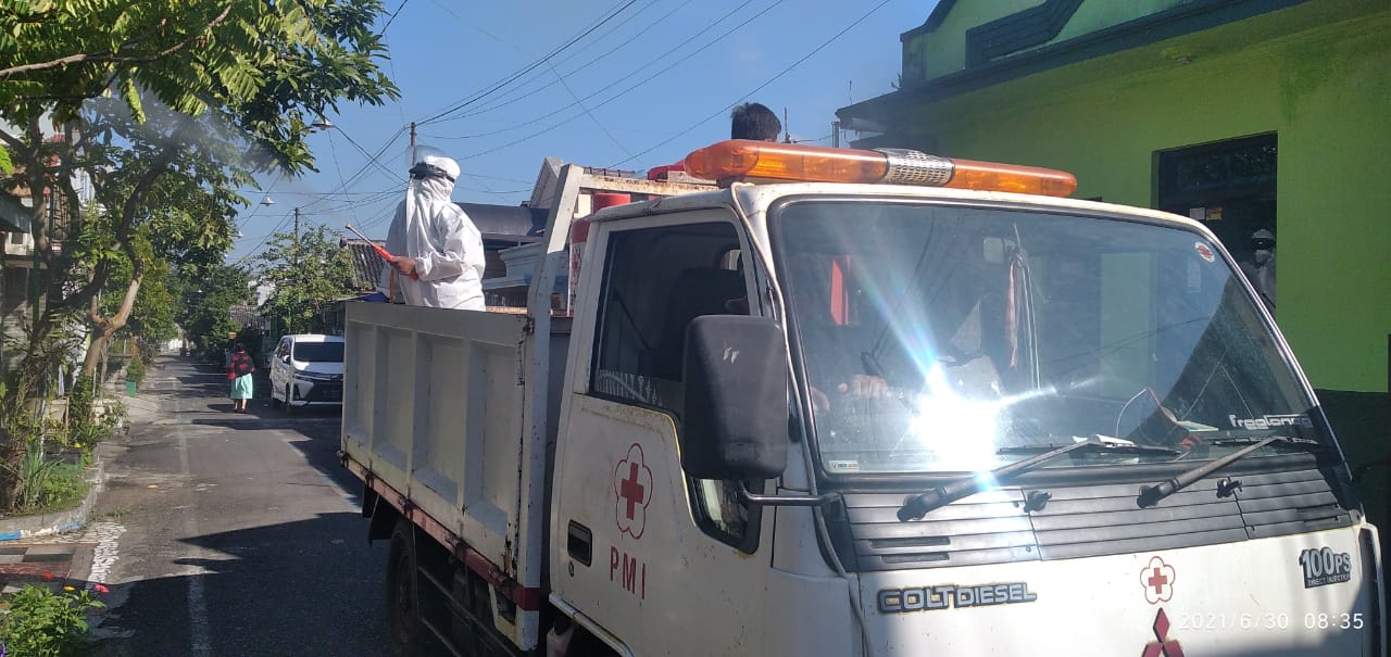 PMI JEMBER - Sebanyak 220 rumah penduduk di Kecamatan Sumbersari, Rabu (30/06/21) disemprot 1.000 liter cairan disinfektan oleh tim relawan Palang Merah Indonesia, Kabupaten Jember. Penyemprotan atas permintaan warga tersebut dilakukan setelah ditemukan warga yang terkonfirmasi positif covid 19. Penyemprotan dilakukan juga untuk mencegah terjadi kepanikan imbas dari mengganasnya serangan Covid-19.