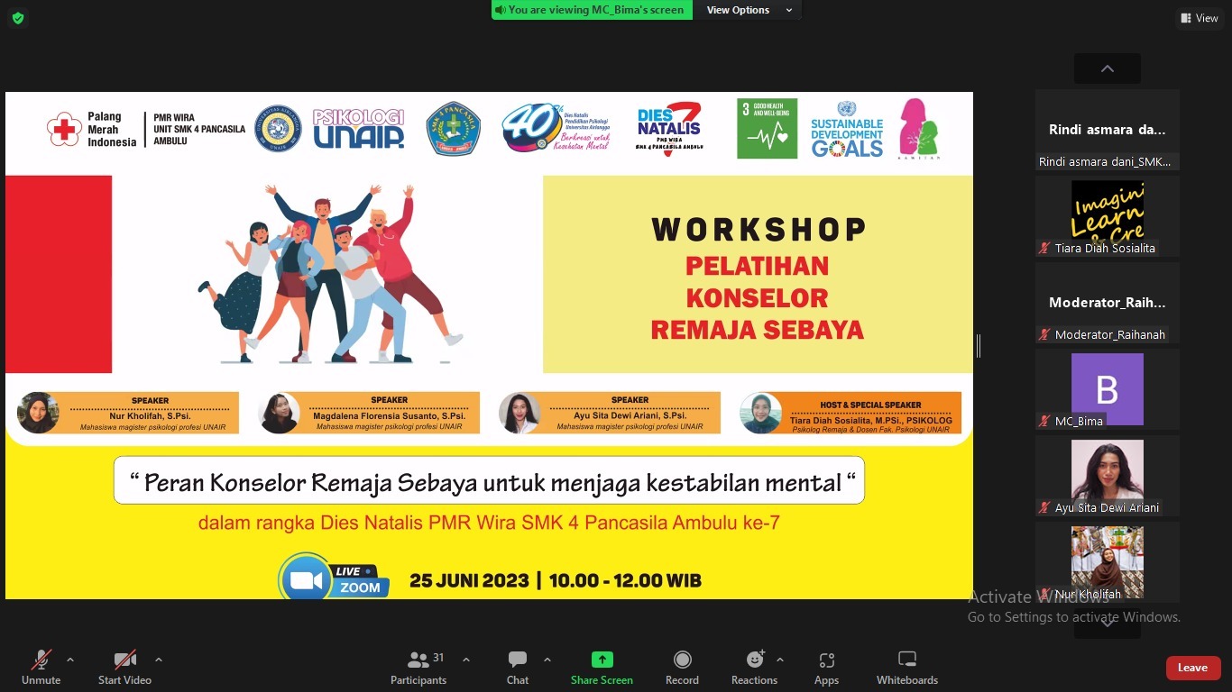PMI JEMBER - PMR SMK 4 Pancasila Kabupaten Jember punya cara kreatif untuk memperingati Hari Ulang Tahun (HUT)-nya yang ke-7. PMR SMK 4 Pancasila mengadakan Workshop Pelatihan Konselor Remaja Sebaya bekerjasama dengan fakultas Psikologi Universitas Airlangga (Unair) Surabaya secara daring, Minggu, 25 Juni 2023, pukul 10.00 - 12.00 WIB. Dengan jumlah peserta 100 orang dengan rincian 85 peserta umum dan 15 panitia dari PMR SMK 4 Pancasila.