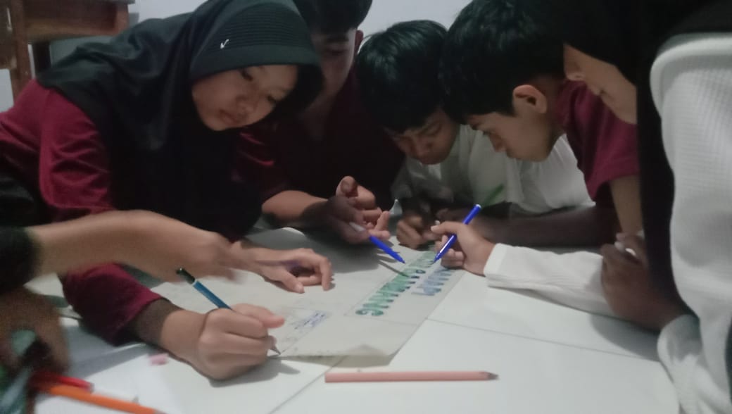 Para anggota PMR Madya SMPN 6 Jember berkolaborasi membuat poster-poster edukatif yang berisi pesan-pesan kunci mengenai mitigasi dan kesiapsiagaan menghadapi potensi bencana. Kegiatan ini dipusatkan di Aula Markas PMI Jember.
