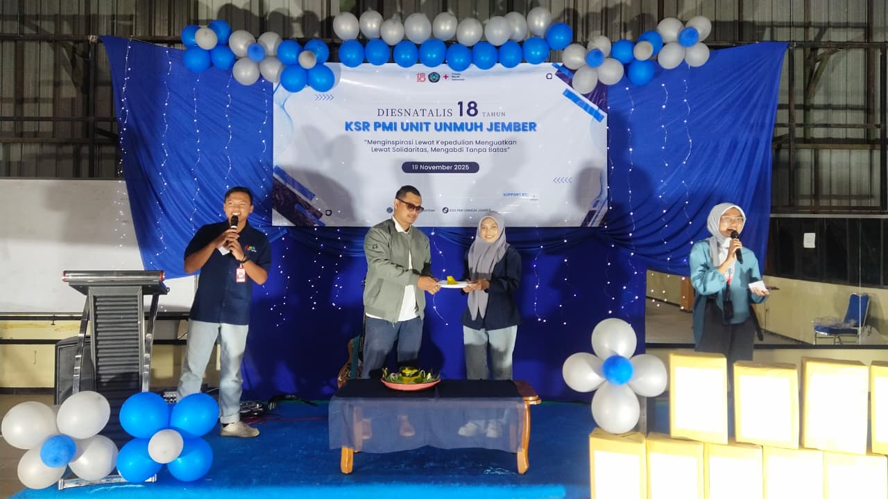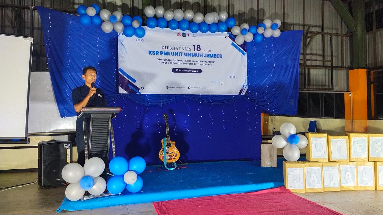 PMI JEMBER – Korps Sukarela (KSR) Palang Merah Indonesia (PMI) Unit Universitas Muhammadiyah (Unmuh) Jember merayakan Dies Natalis yang ke-18 di salah satu Aula UKM Lt 3 Unmuh Jember pada Rabu Malam 19 November 2025. Selain dihadiri pihak kampus, acara dies natalis juga dihadiri oleh Pengurus PMI Jember bahkan salah satu anggota KSR Unmuh angkatan pertama.