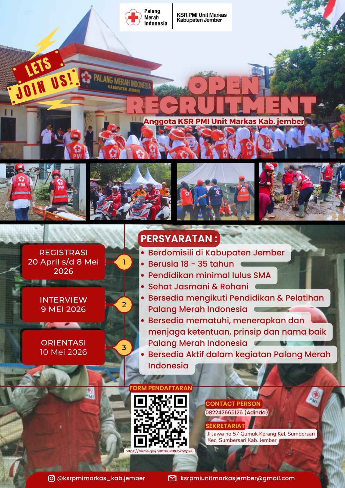 Bagi masyarakat yang berminat bergabung, proses pendaftaran dilakukan secara daring (online) untuk memudahkan aksesibilitas. Berikut adalah detail informasinya : Link Pendaftaran: https://bit.ly/OprecKSRMarkas2026.Informasi Lebih Lanjut 082242665126 (Adinda), Sekretariat : Markas PMI Kabupaten Jember