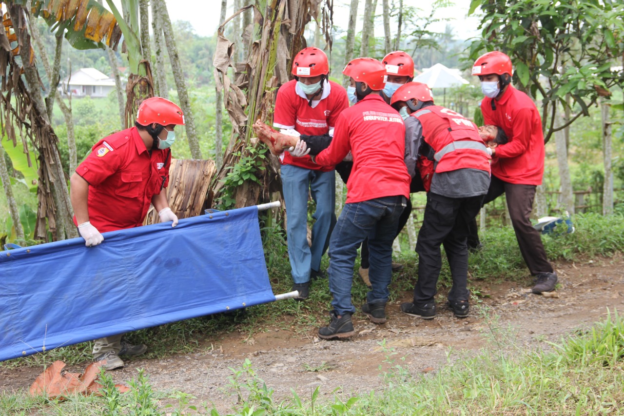 Jember, Sebanyak 250 personil relawan palang merah indonesia Kabupaten Jember, Sabtu pagi (30/10/21) mengikuti latihan tanggap darurat tuntas di lapangan kawasan wisata watu jubang di desa Lampeji, Kecamatan Mumbulsari. Latihan yang dihadiri oleh PMI Propinsi, BPBD, dan Muspika Mumbulsari tersebut disimulasikan terjadinya bencana tanah longsor yang merenggut tiga korban meninggal dunia dan puluhan mengalami luka luka.
