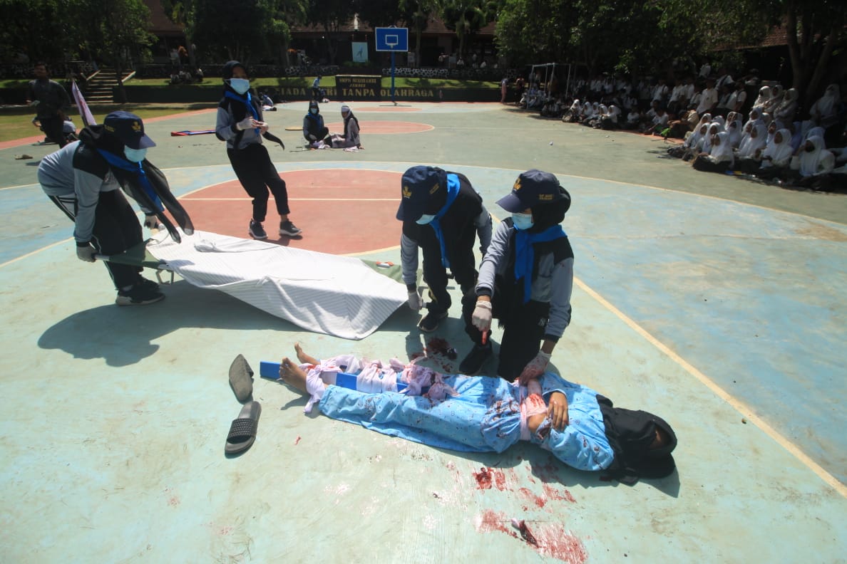 PMI JEMBER – Palang Merah Remaja (PMR) SMPN 1 Sukorambi memanfaatkan momentum Masa Pengenalan Lingkungan Sekolah (MPLS) untuk sosialisasi. Caranyapun unik, dengan melakukan simulasi Pertolongan Pertama oleh PMR Madya SMPN 1 Sukorambi di hadapan ratusan siswa baru, Kamis, 20 Juli 2023.