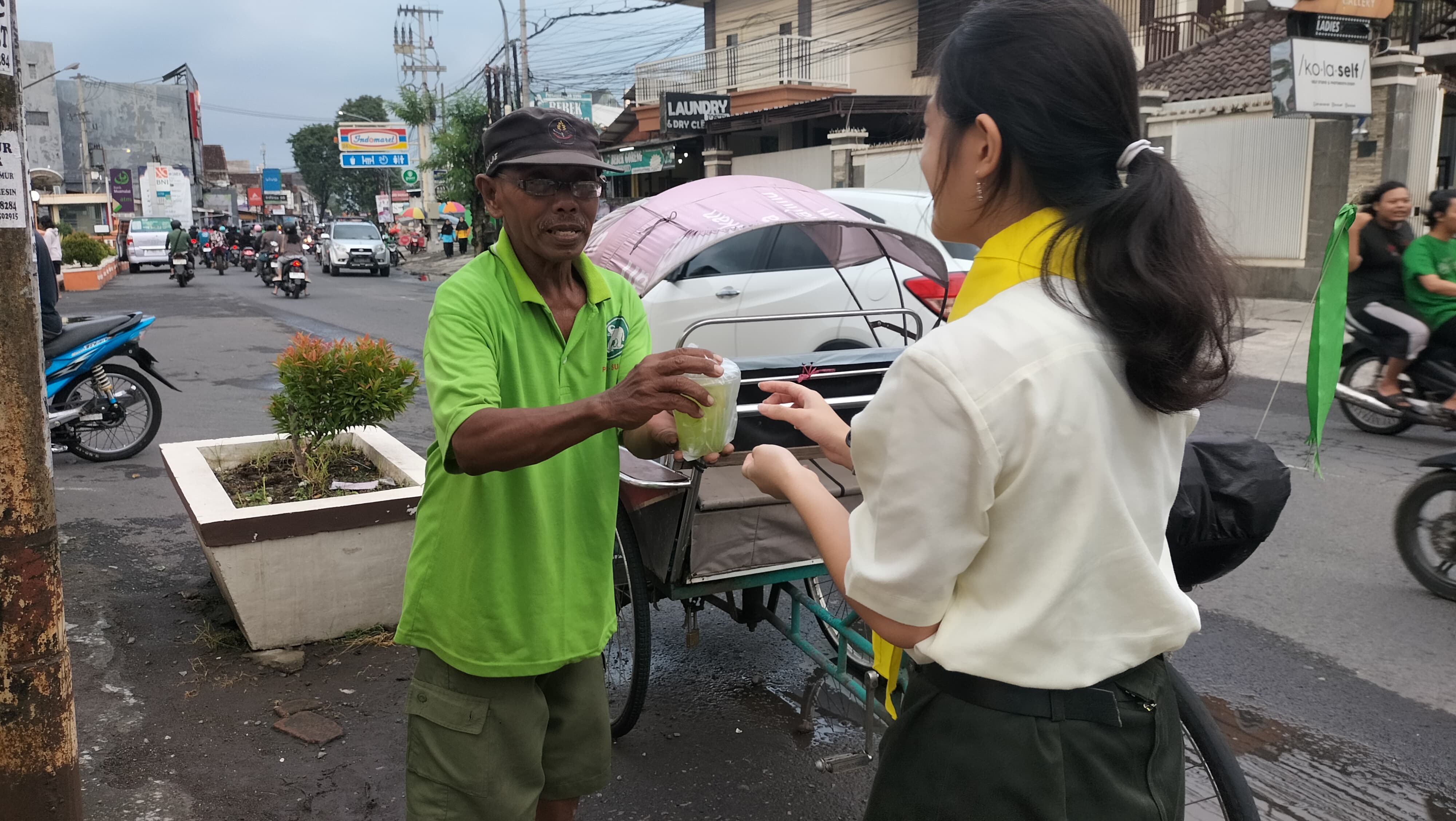 abang becak dan pengguna jalan di depan markas PMI Kabupaten Jember merupakan
